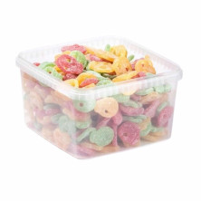 Ingredientes: açúcar, xarope de glicose, gelatina, ácido regulatório (ácido málico E-296), sabores (morango 0,02%), corantes (E-120,01%).